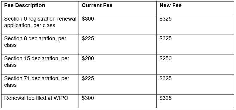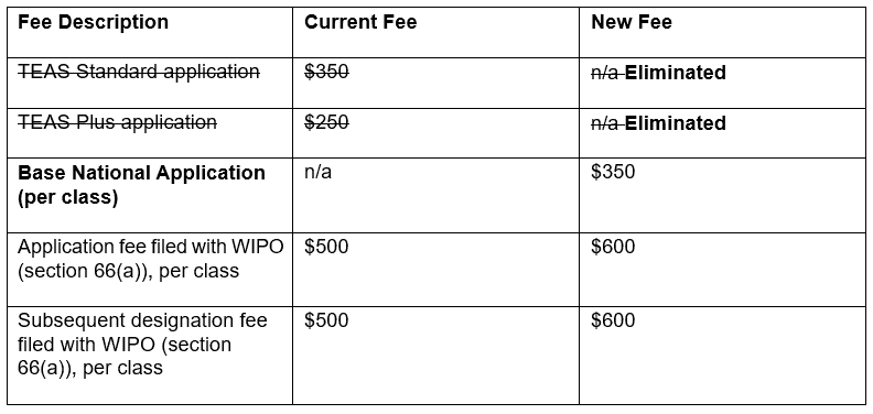 The above fee changes will not apply to Madrid Protocol designations. However, filing fees to the USPTO for Madrid Protocol applications will now be increased to $600 per class.