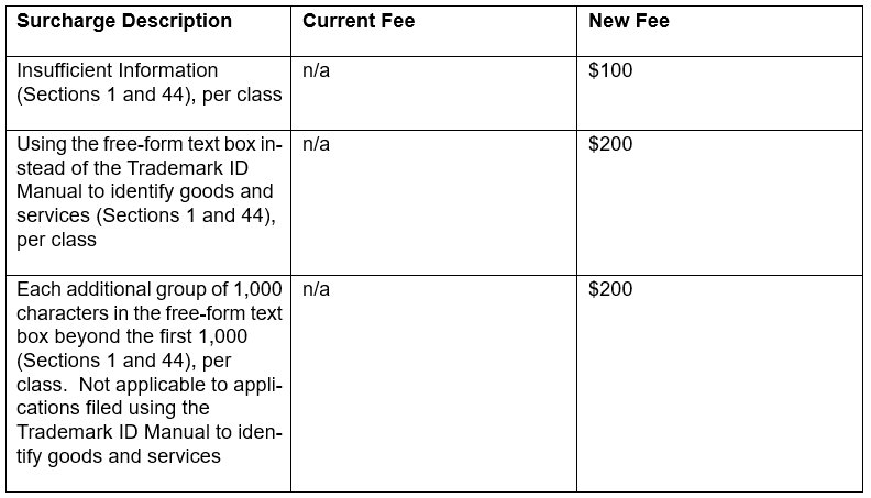 Applications filed with identifications of goods and services not included in the list will be subject to a $200 surcharge per class. Additionally, the USPTO is setting a new fee of $200 for each group of 1,000 characters (beyond the first 1,000 characters per class), including punctuation and spaces. The 1,000 character fee will not apply to applications filed using identifications of goods and services from the USPTO Trademark ID Manual and Master List.